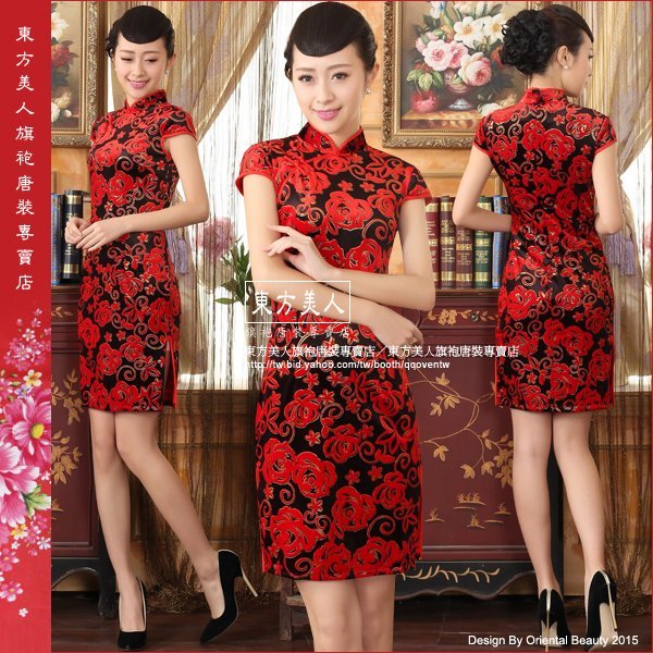 東方美人旗袍唐裝專賣店玫瑰花語。彈力金絲絨提紋紋時尚包袖短旗袍